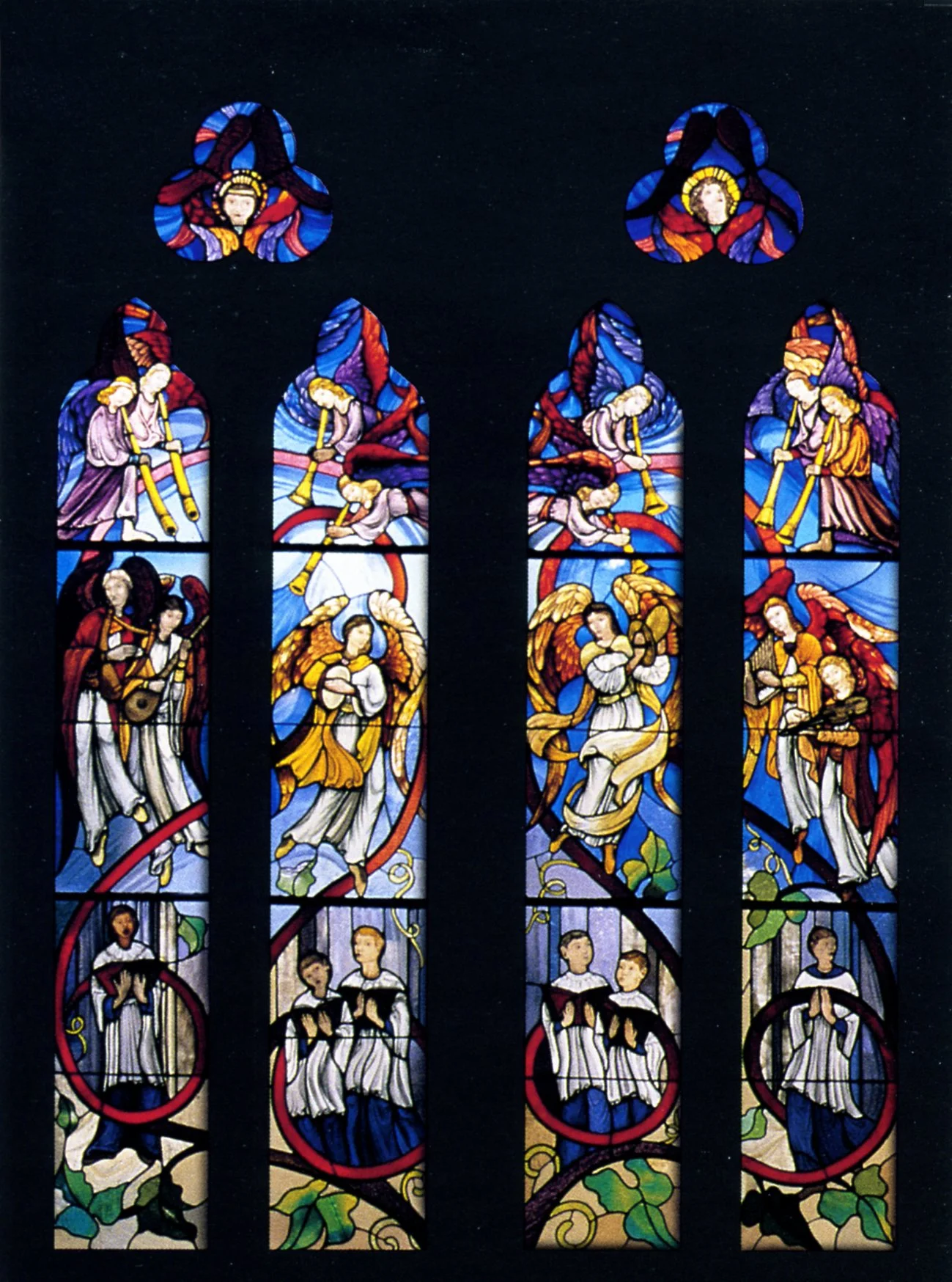Above them angels, equipped with the other instruments mentioned in Psalm 150, add their heavenly harmonies in a glorious cacophany of light and colour and imagined sound.