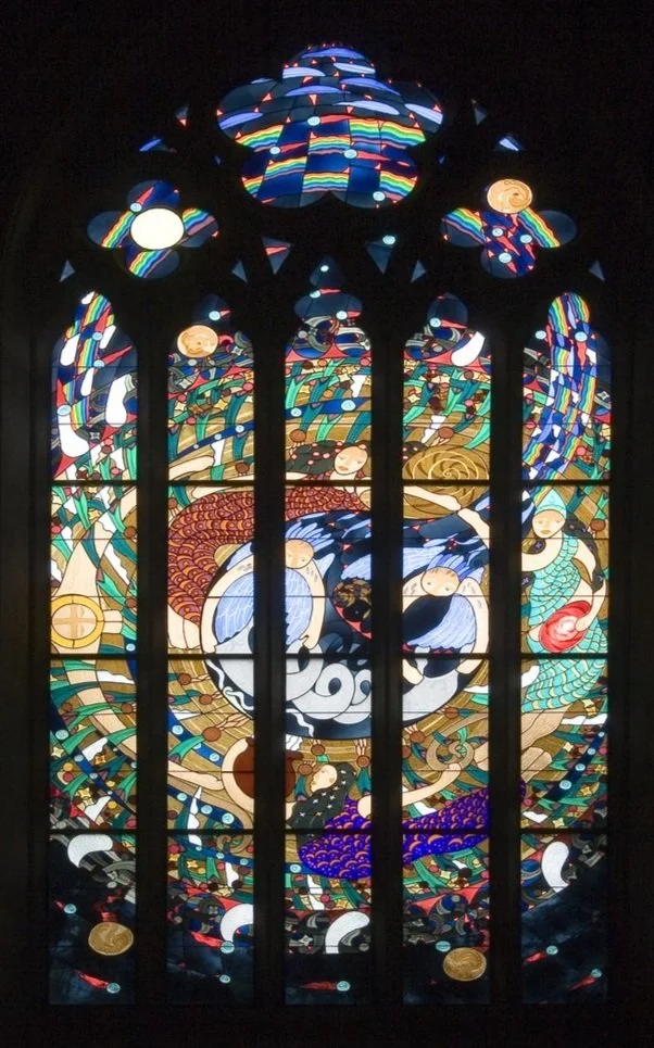 Inspiration for this dynamic design is the theme of Mary Magdalene and the women at the empty tomb. The circle and the spiral are important elements in this window. One circle is that of the circle of the earth which embraces the figures around the tomb, while another circle leads us from the tomb, around the heavens back to the halo of Christ. The strong circular movement is symbolic of the supportive nature of women’s ministry, with the figures bound together with hands out-stretched and integrated with the landscape. God is shown at the centre of the design as a single point. All potential spirals from God.